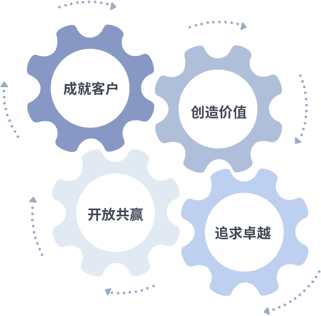 成就客户是一切决策的出发点,,创造价值是衡量所有工作的标准,,,追求卓越是我们做事做人的态度,,开放共赢是我们的格局也是最终的结果。。。。价值观的齿轮环环相扣,,,,推动着组织里的每个人不断向前。。。